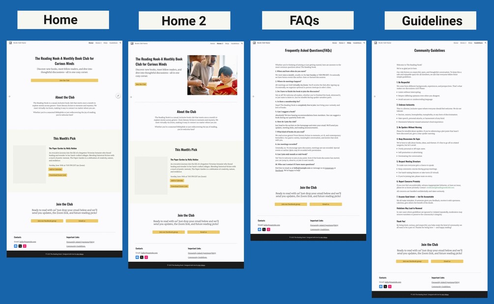 Preview Live DemoWhether you're just starting a book club or refreshing an existing one, this template helps you build a polished, mobile-friendly site in minutes. No coding required.